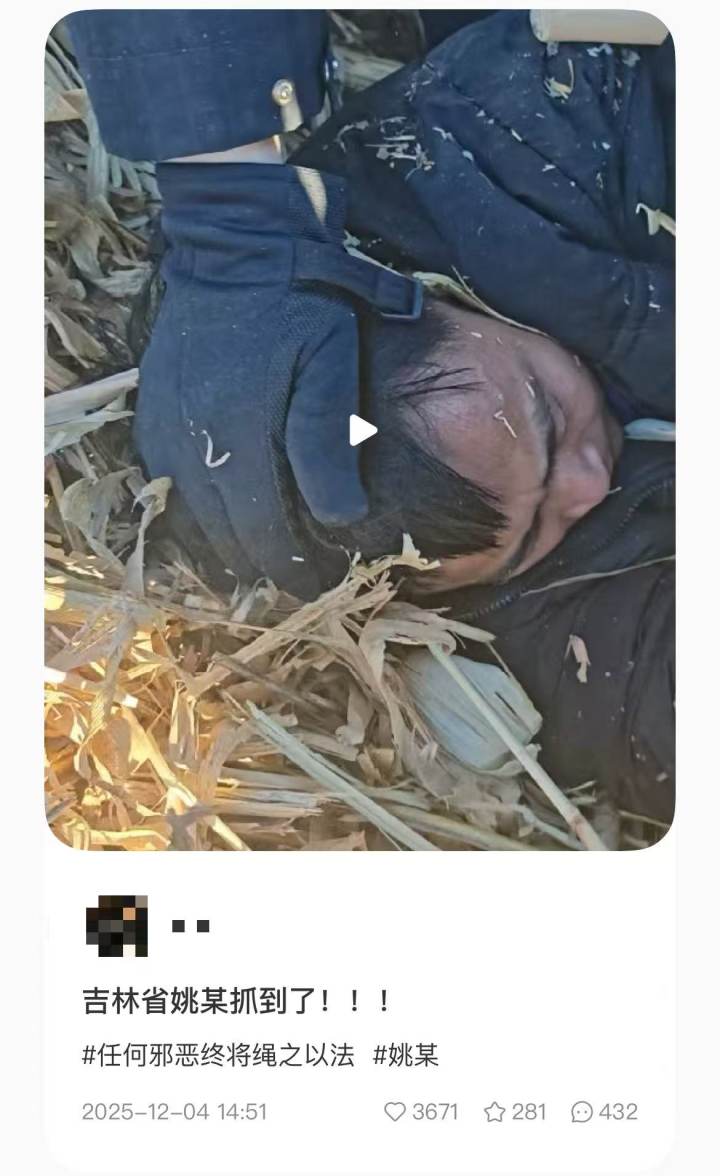 今天下午,办案民警告诉大河报《看见》记者,姚某在松原市乾安县抓获。据九派新闻报道,民警称,“人抓到了,在一个空房子里抓到的,案件目前在进一步侦办中。”