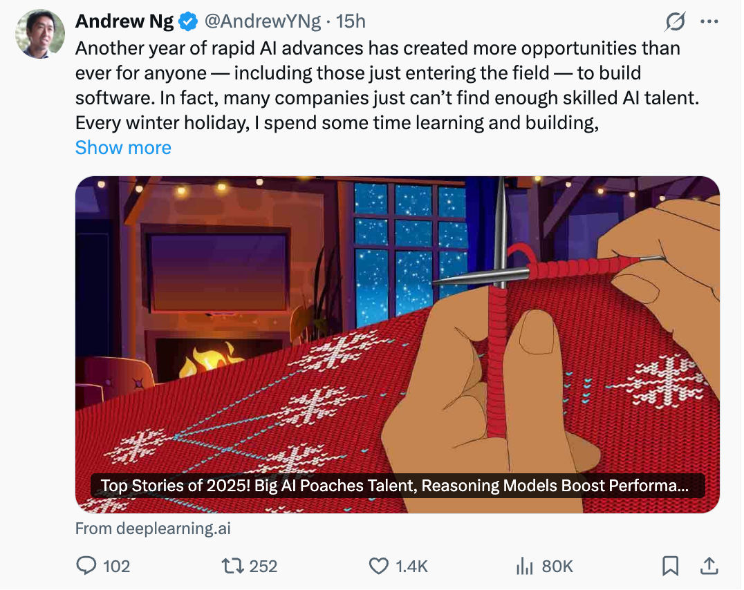 又一年AI技术的飞速进步,为每个人创造了前所未有的软件开发机遇,包括刚刚踏入这个领域的人。现实情况是,如今很多公司都难以招到足够多的熟练AI人才。每年冬天,我都会抽出时间学习和做些项目,也希望你能一起。这不仅能帮我巩固旧技能、掌握新本领,也能为你的科技职业道路增添助力。